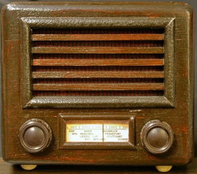 ![]() Zur Geschichte des GerätsDieses Radio wurde 1951 zu einem Preis von 45 DM auf den Markt gebracht und war damit für den Massenmarkt konzipiert. Es kommt mit einer Röhre aus, mit der sowohl der Audion-, als auch den Verstärkerteil realisiert wurden. Es gab hier anscheinend mehrere Gehäusevarianten - meines besteht aus Holz. Im Internet sind aber auch Abbildungen von Geräten mit Kunststoff- bzw. Bakelit-Gehäusen zu sehen. |